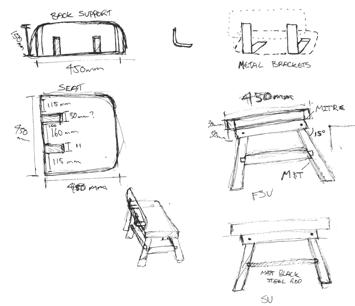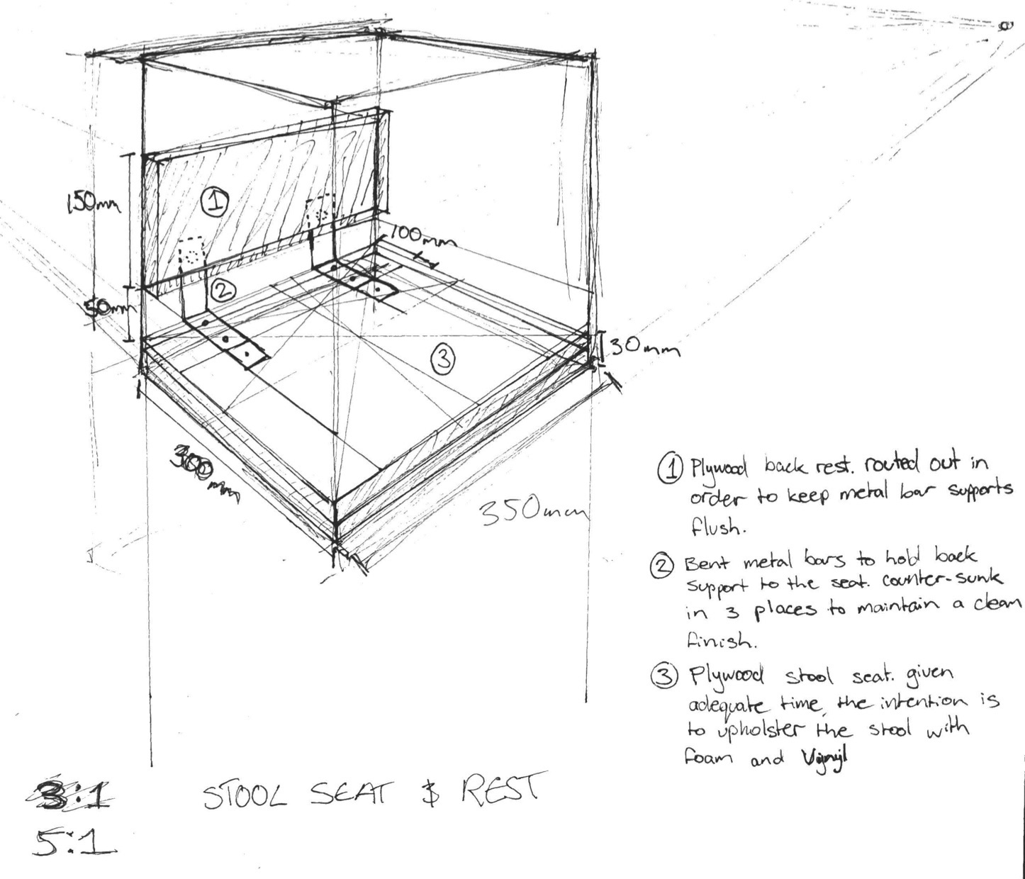 In these sketches, I decided to explore the ways in which i might be able to incorporate the mortise and tenon joint in order to fulfil the required criteria for assessment. I began by experimenting with a foot rest on my stool, though my intentions were to make my stool one that was on the smaller side of the limitations, and so the practical use of the foot rest would be lost. i also explored the use of a steel rod as a foot rest to the same conclusion.