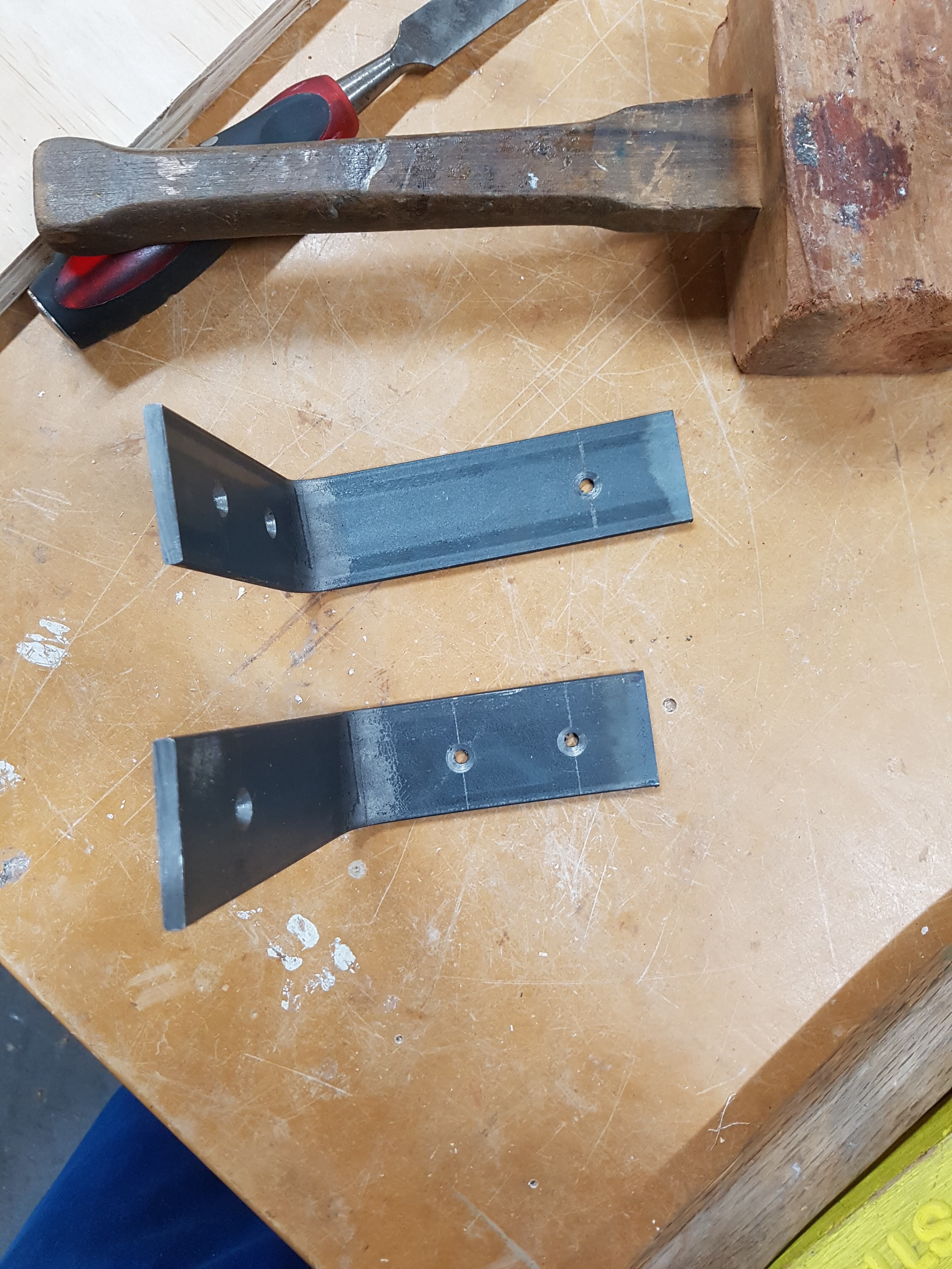 6. Cold form steel flat bar to ~100° angle and drill counter-sunk holes in order to attach to the stool seat
