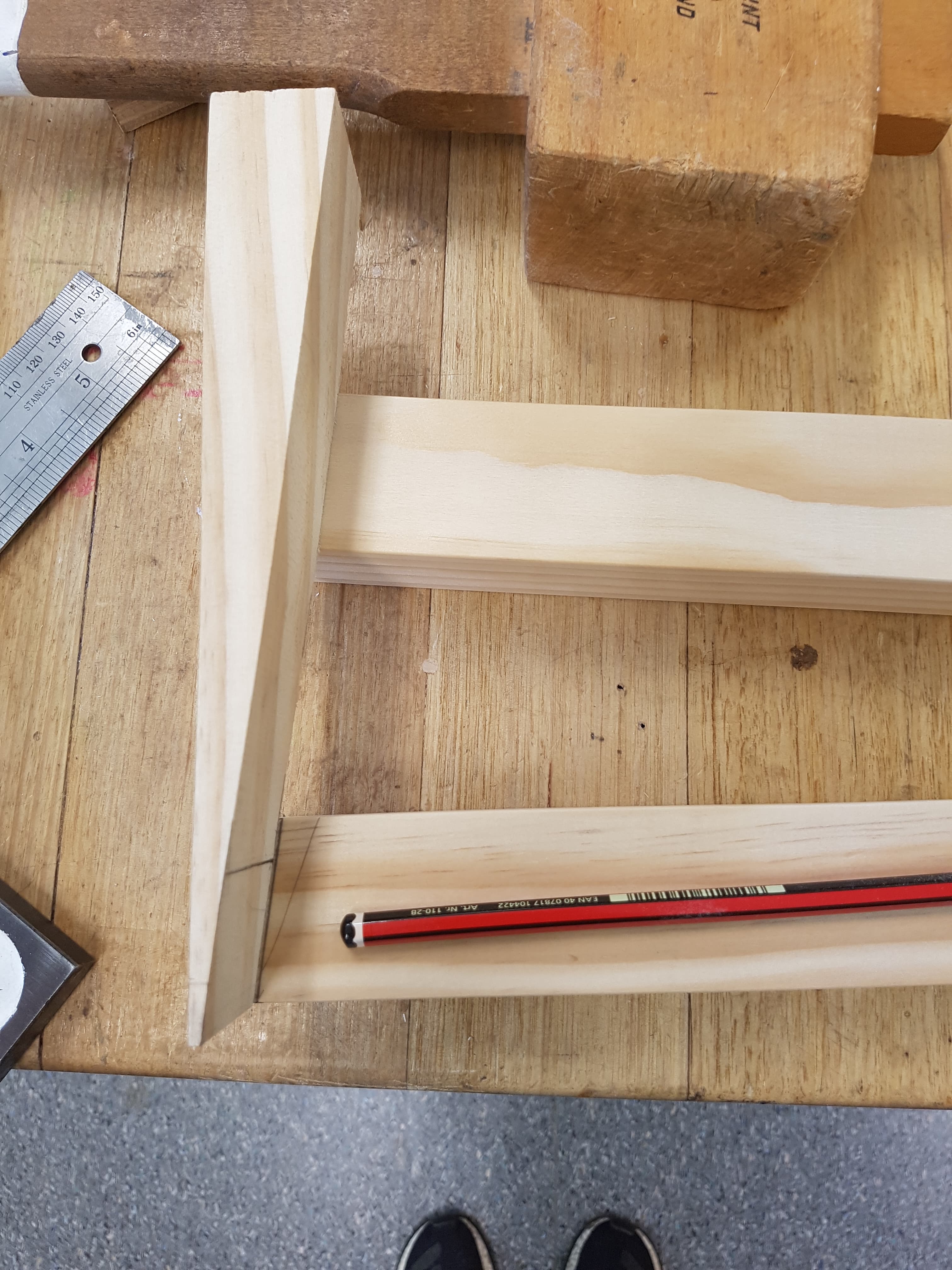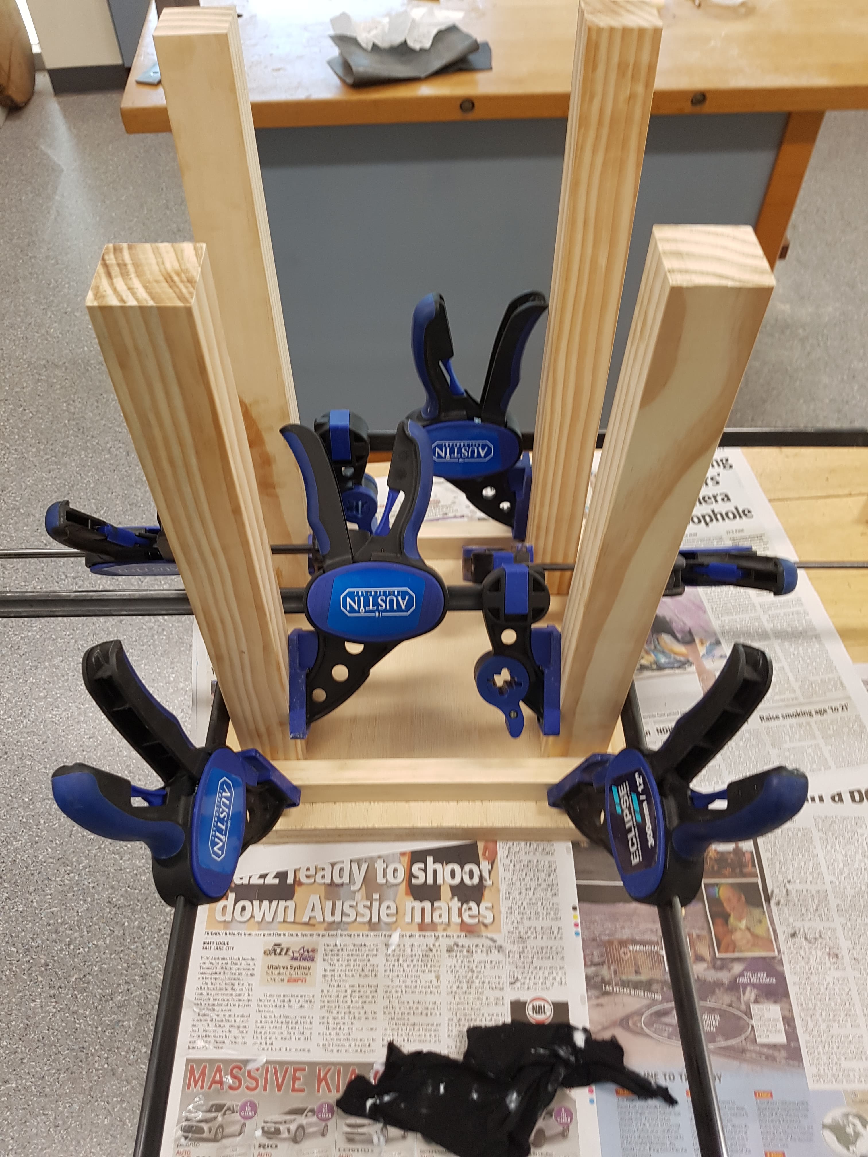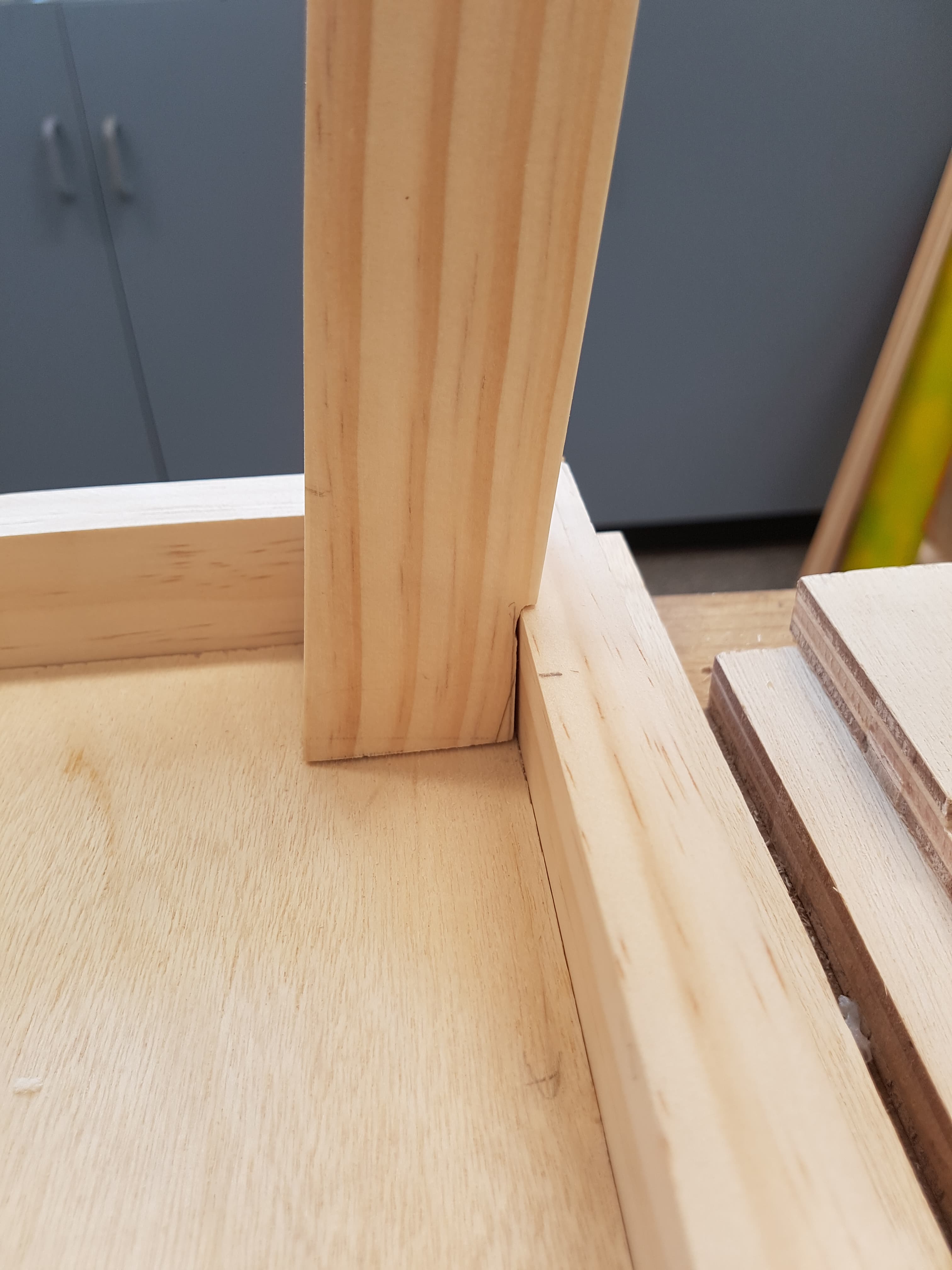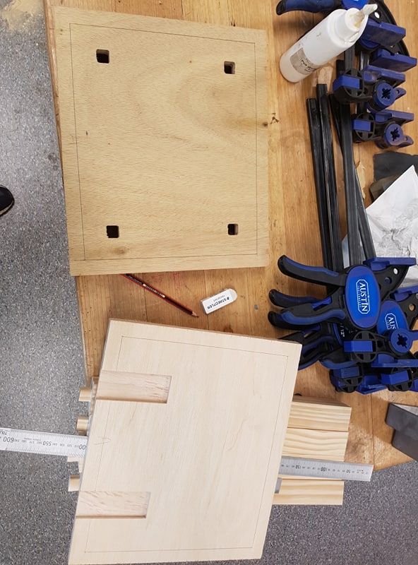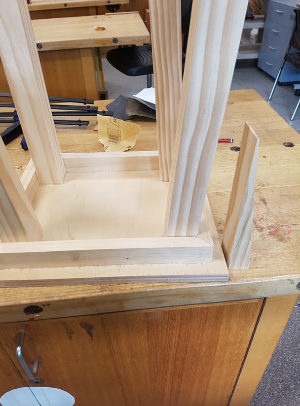 Before gluing each piece of the seat together, a line was pencilled around the frame of the top piece so that after gluing, screws could be put through both pieces of the seat and into the mitred frame underneath. This level of stability was not required, but would help to further stabilise the legs and avoid breakage, particularly in a classroom environment. After gluing, 35mm screws went around the inside of the pencilled line.