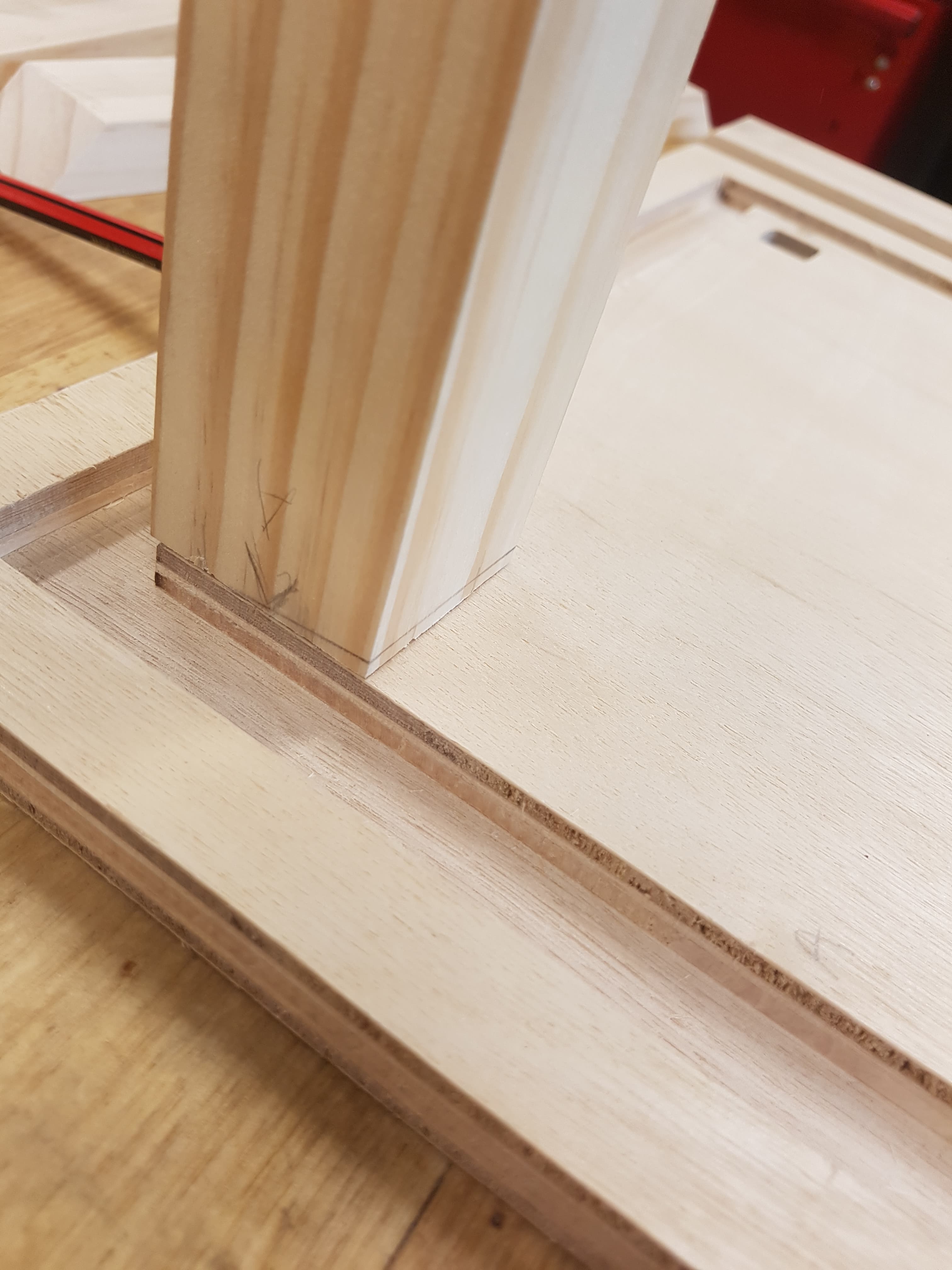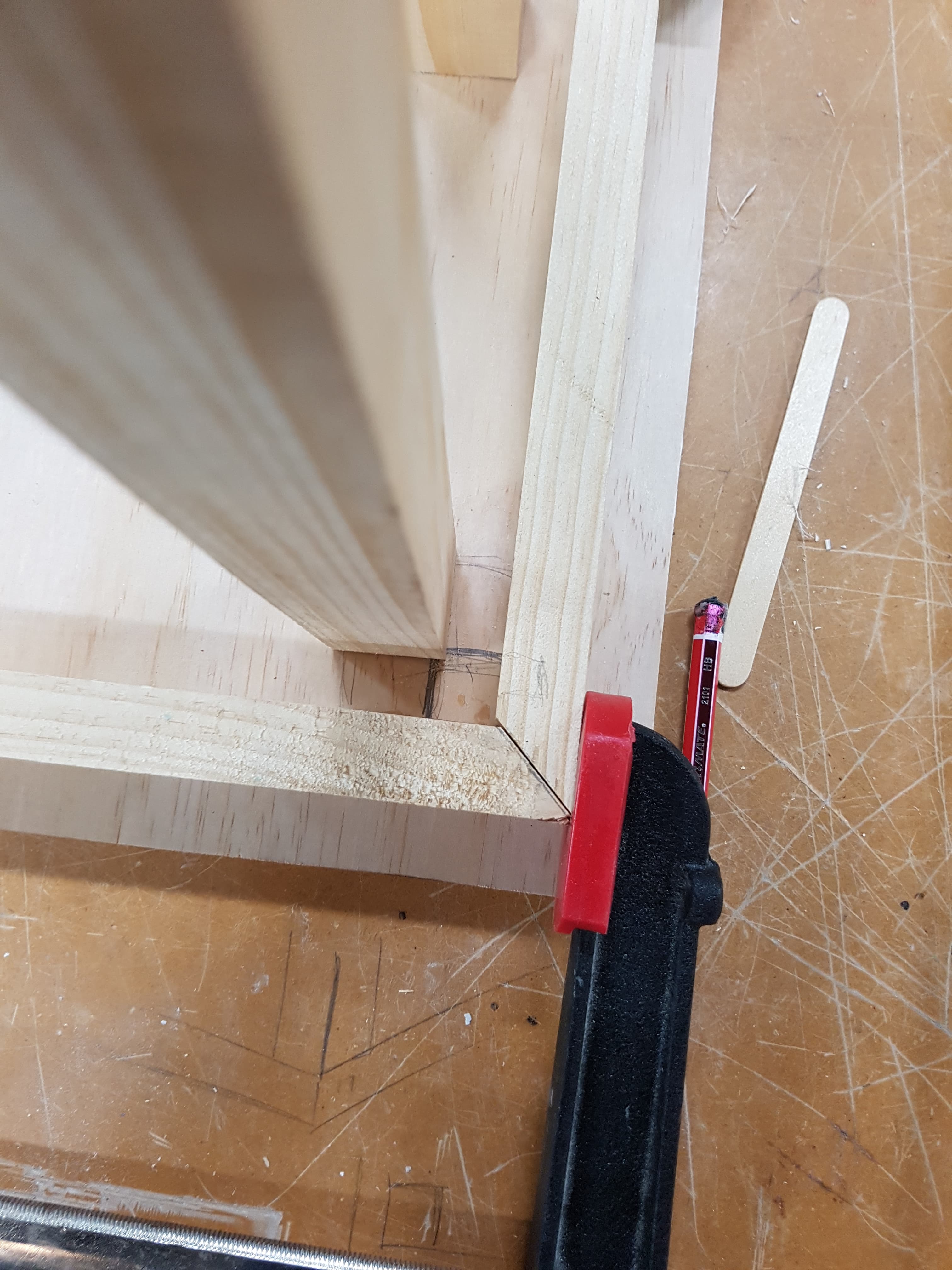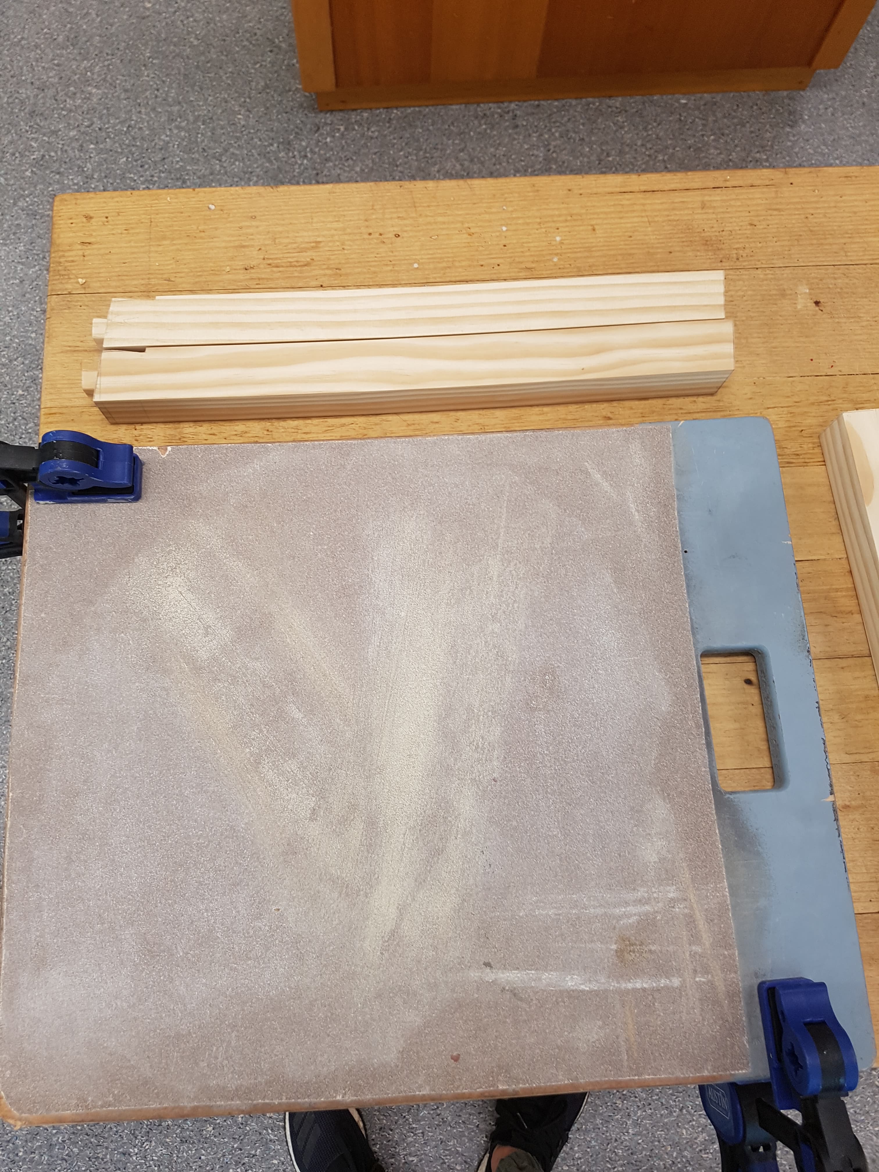 Before gluing each piece of the seat together, a line was pencilled around the frame of the top piece so that after gluing, screws could be put through both pieces of the seat and into the mitred frame underneath. This level of stability was not required, but would help to further stabilise the legs and avoid breakage, particularly in a classroom environment. After gluing, 35mm screws went around the inside of the pencilled line.
