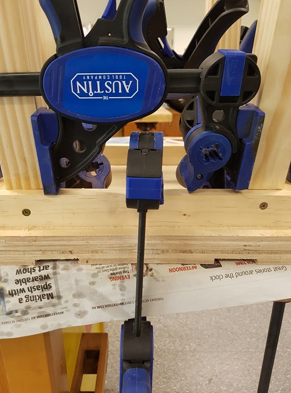 I fastened the stool to the workbench using a further two clamps before drilling small pilot holes through the frame and legs. These were then filled with 35mm screws to provide further stability and to utilise the function of the mitre frame once again.