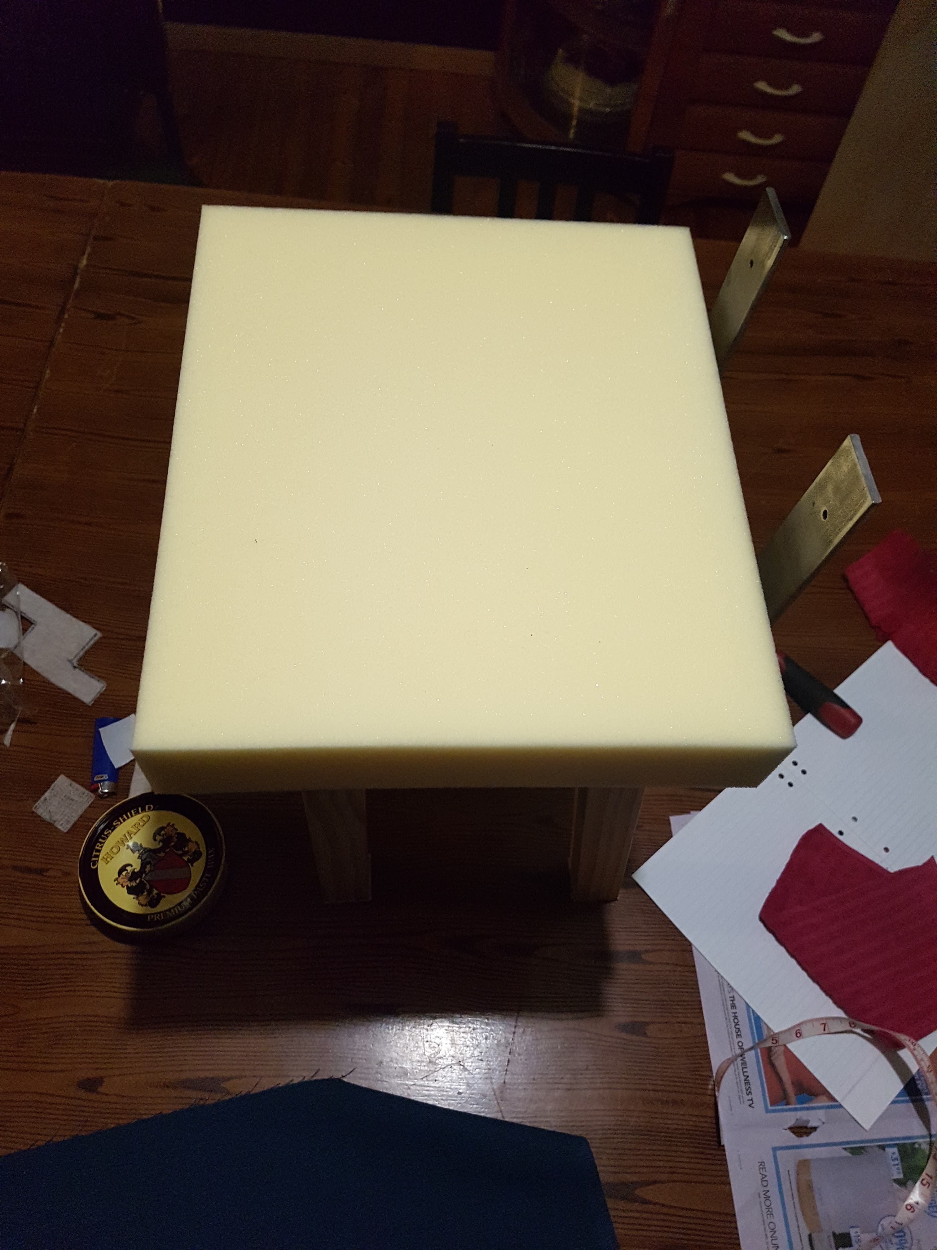 Using a staple gun, I first stapled the material down to the top-side of the seat, as this would be the best way to ensure a clean finish to the upholstery given the positioning of the metal brackets at the back of the stool. The foam was then placed on top of the seat, and then the seat flipped over in order to staple the rest of the material to the underside of the stool.