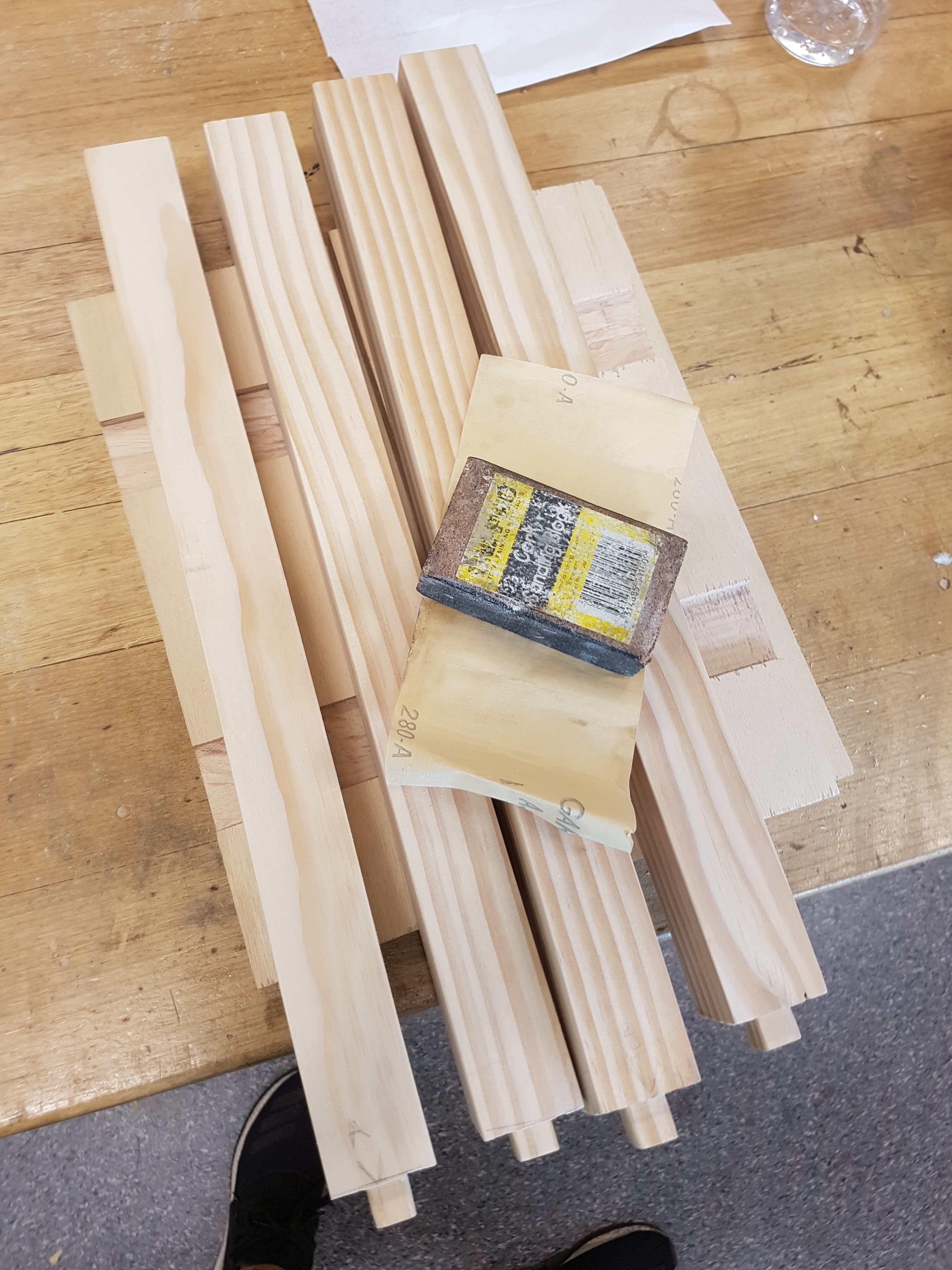 After cutting the bottom of the legs on the bandsaw, I sanded them down in order to keep a smooth finish, while trying to maintain the square of the bottom as much as possible to avoid rocking.